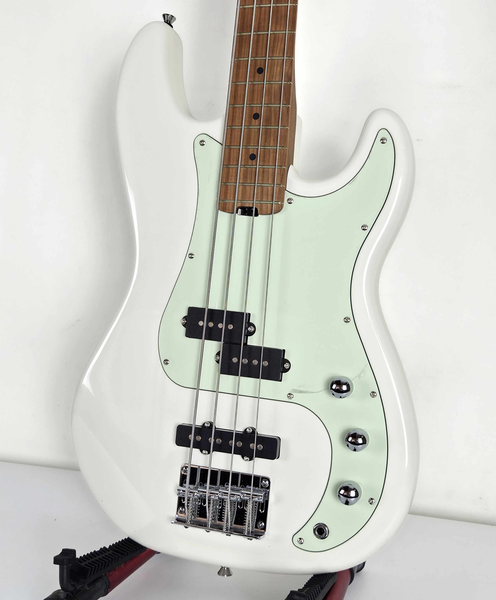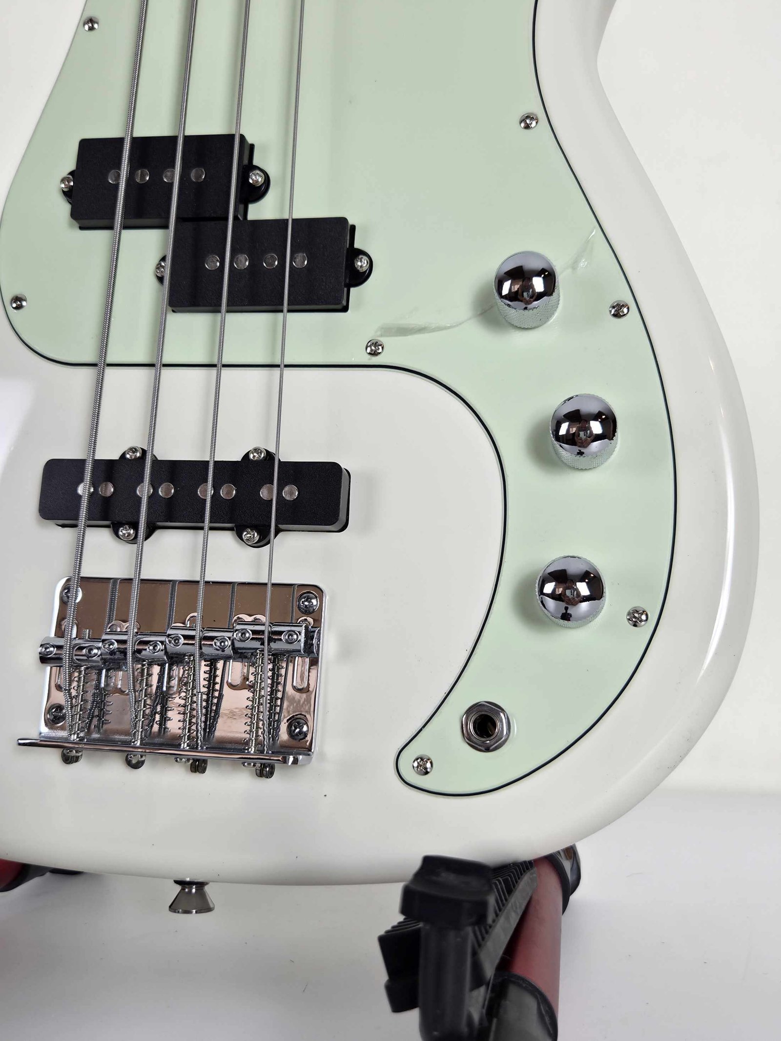 El bajo eléctrico Tagima presenta un cuerpo fabricado en Ayous (madera blanca africana) o Swamp Ash para la versión en color natural. Su mástil de arce, con diapasón de 20 trastes del mismo material, le brinda un tono claro y resonante. Equipado con dos pastillas single coil modelo JJ de Tagima, permite un sonido versátil y nítido. Sus controles incluyen dos volúmenes y un tono para ajustar a gusto. Con un puente cromado estándar y clavijas vintage cromadas