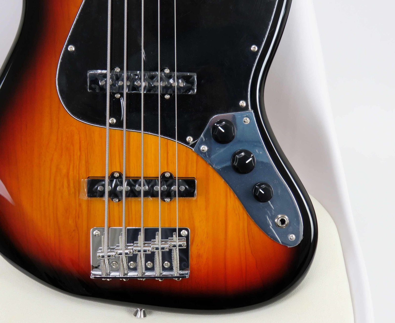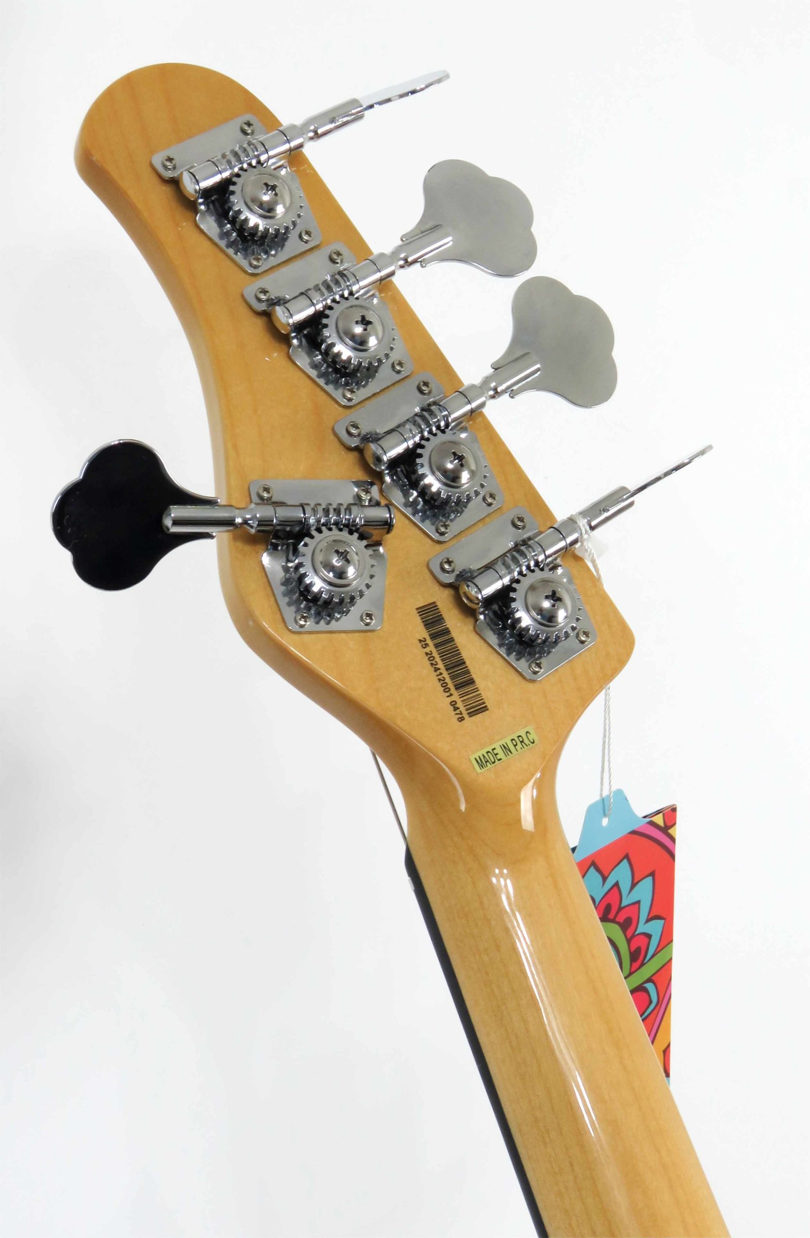 Cuenta con dos controles de volumen (uno para cada pastilla) y un tono general, lo que permite esculpir el sonido de forma práctica y efectiva. Las clavijas cromadas aseguran una afinación estable, mientras que su diseño clásico tipo Jazz Bass lo hace visualmente atractivo y familiar.