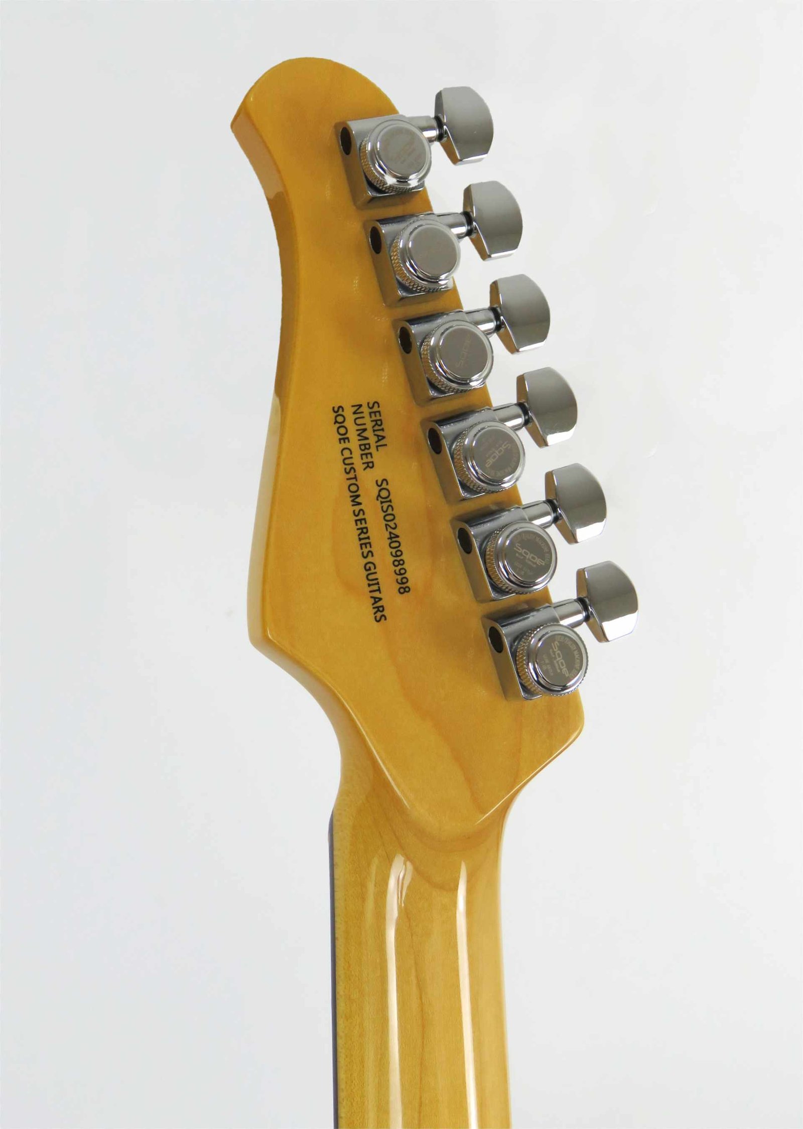 Presentamos la SQOE Sest 900, una impresionante guitarra estilo Stratocaster que combina una estética clásica con una ejecución moderna. Con una tapa de flamed maple sobre un cuerpo de aliso, este instrumento ofrece tanto atractivo visual como una rica sonoridad. El mástil y diapasón de arce brillante, con un cómodo perfil slim C, garantizan una ejecución fluida a lo largo de sus 22 trastes jumbo de níquel.