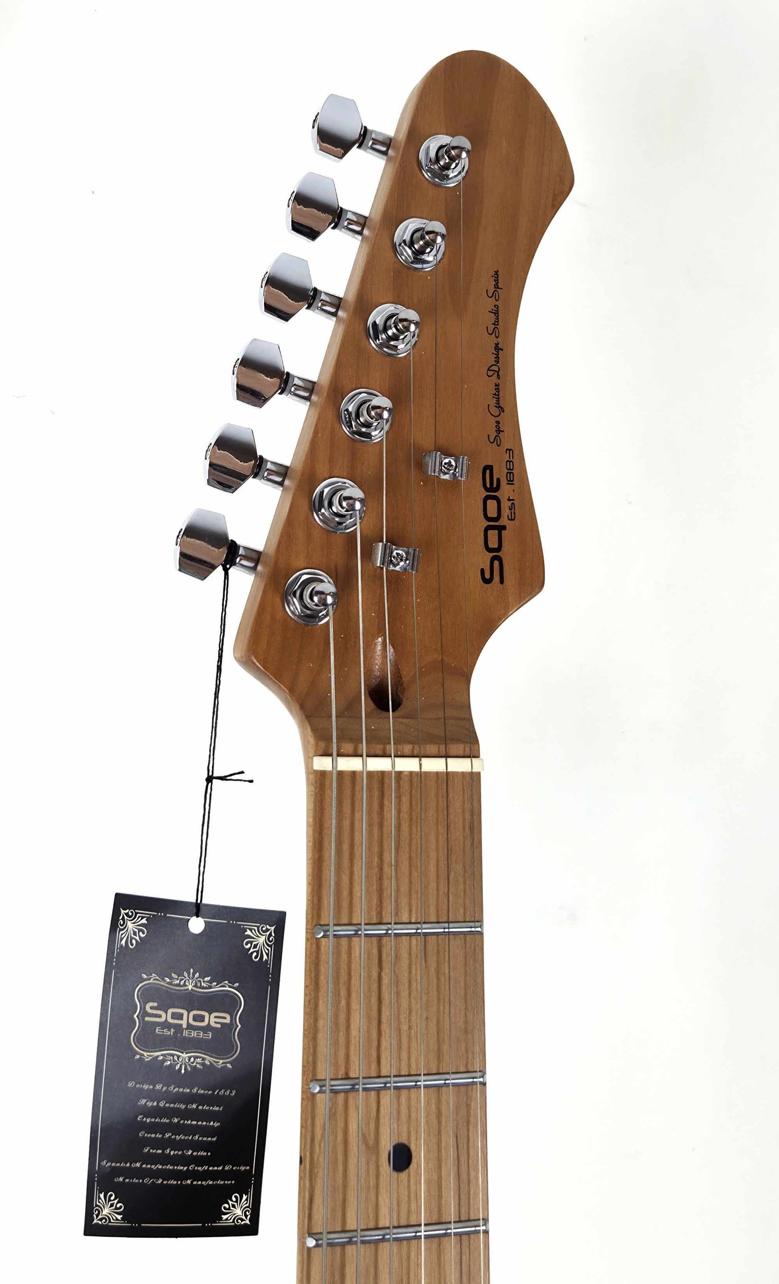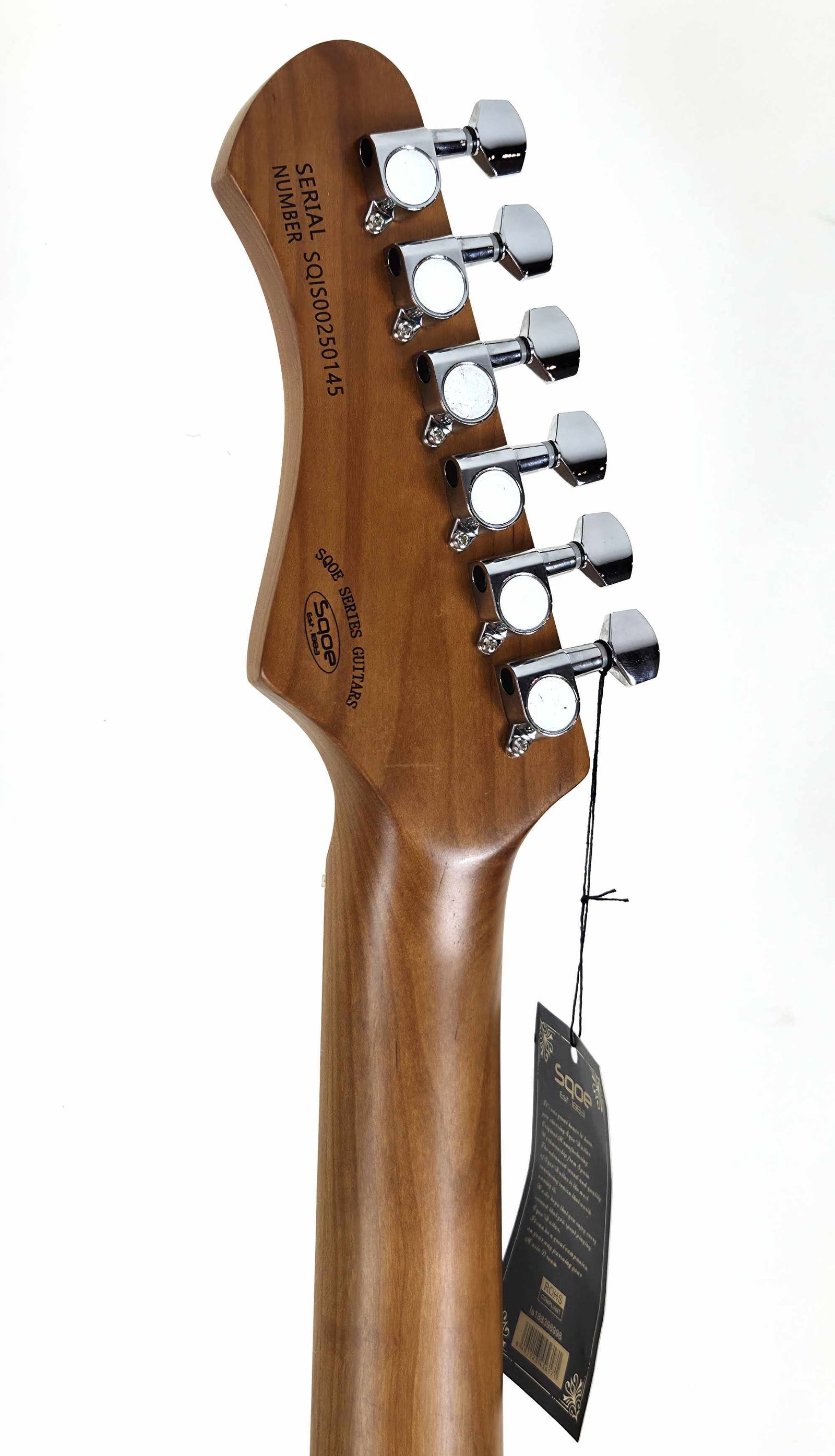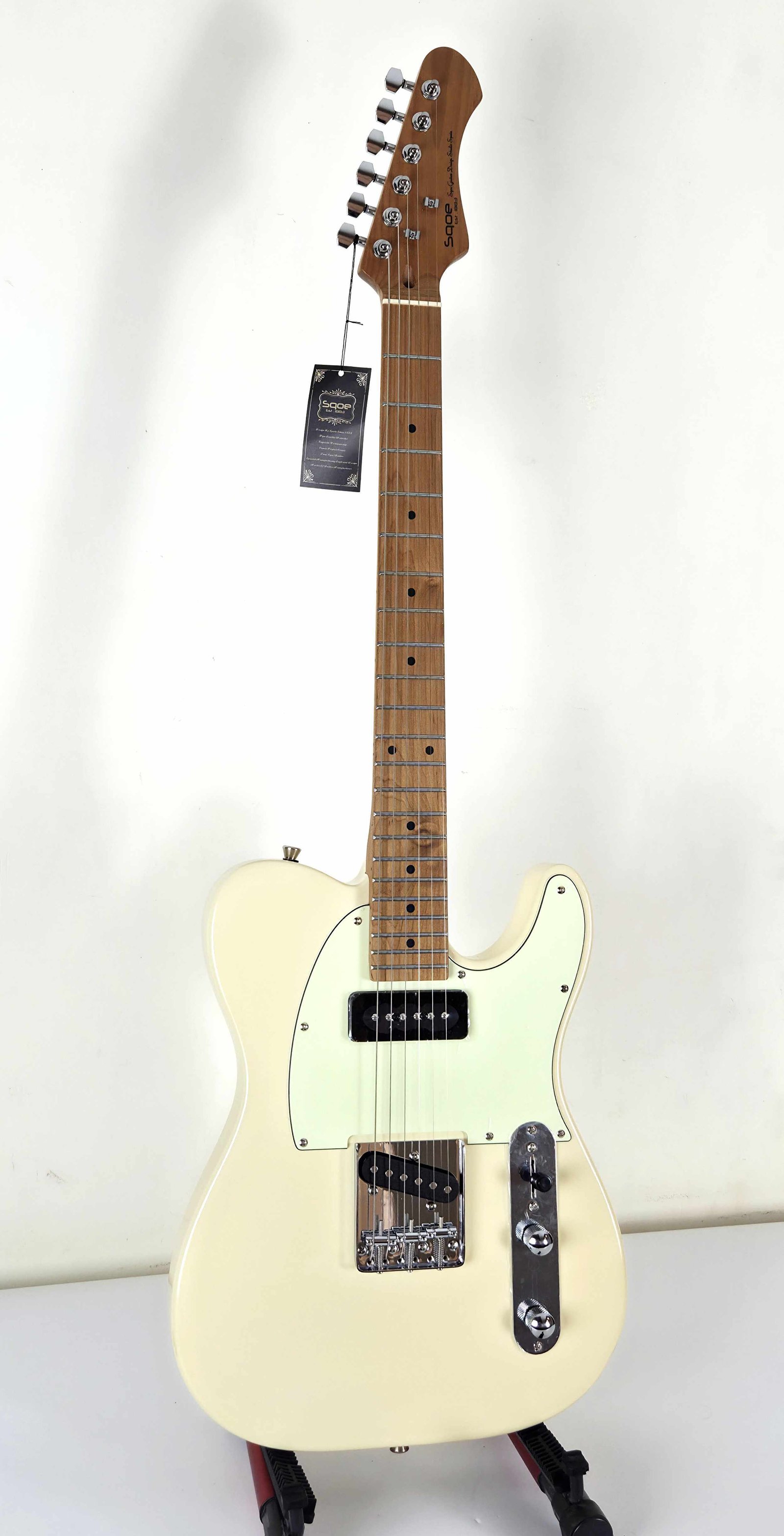 La SQOE SETL400 es mi Tele “sin excusas”: cuerpo de álamo (poplar) con acabado glossy, diapasón de roasted maple/carbonizado y 22 trastes, pensada para darte ataque, definición y esa respuesta rápida que se siente apenas haces el primer acorde. Es una guitarra directa, cómoda y práctica para tocar de verdad (ensayo, escenario o grabación), con el vibe clásico tipo TL pero con feeling moderno.